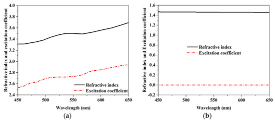 (a) Tungsten’s and (b) Silicon dioxide’s excitation coefficient and refractive index in the visible optical range.