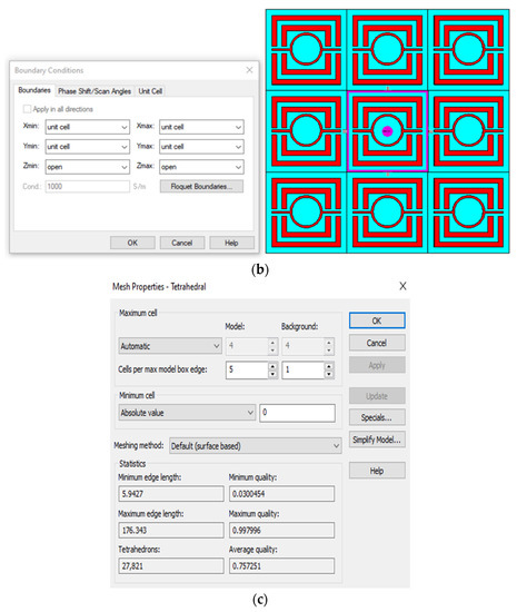 A proper and correct simulation setup is required to obtain the necessary absorbance from the dispersing value. CST Microwave Studio 2019 used terahertz mesh in a frequency-domain solver to perform numerical simulations. The proposed MMA’s boundary conditions and array structure are depicted in Figure 3a, and Figure 3c reveals the proposed MMA’s tetrahedral mesh properties. For transverse electromagnetic (TEM) propagation mode, an installation of a port point is created using both the positive and negative z-axis. The impedance matching process between the incident wave and the meta surface takes along the positive z-axis. In addition, the x and y axes are constrained, whereas the positive z-axis is regarded as an open add space for the TEM propagation mode. Moreover, y-axis and the x- axis boundaries are specified as perfect magnetic conductors (PMCs) and electric conductors (PECs). The magnetic field is asymmetrical in the PMC and symmetrical in the PEC, but the electric field is asymmetrical in the PEC and symmetrical in the PMC. Since the z-axis is considered to be a free space with a perfectly matched layer (PML) in the opposite direction, scattering is reduced along with the operational wavelength. The configuration has all three axes operating in opposite directions from one another. For this simulation, we assume that a planar, wide-spectrum wave, and linearly polarized will reach the top of the proposed absorber. The proposed design has been protected when using a perfect electric and magnetic conductor, an electromagnetic response diagram of a crossed rectangle array that is polarization insensitive. As shown in Figure 3b, the optical responses for both the TM and TE propagation modes are identical for these symmetrical 3 × 3 array arrangements. The x and y axes establish the unit cell’s TE and TM mode boundary conditions. When a higher mesh order is applied, it is possible for the simulation’s results to be more accurate. All the data has been obtained using frequency domain analysis. In addition, a time-domain analysis may be performed on this specific type of absorber simulation. A tetrahedral mesh was combined with an adaptive mesh generation technique to perform the simulation. The substrate’s dielectric properties are estimated to have a free space propagation impedance of approximately 377 Ω. The quality of this tetrahedral mesh analysis goes somewhere between 0.0300454 and 0.997996 and the lowest and highest corner values are 5.9427 nm and 176.343 nm, respectively. In order to achieve the most accurate results from the simulation, a mesh with a total of 27,821 tetrahedrons and an average quality of 0.757251 was used. Regarding the convergence of the simulation process that CST MWS performed, we did not have any problems.
