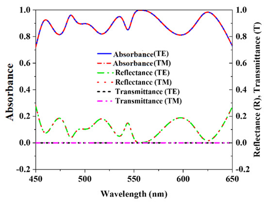 Tungsten has a very excellent demonstration to impedance matching in open space, and it does not have any surface plasmon resonance at wavelengths of the optical region. Tungsten is used both for the resonator and back layers in the proposed MMA absorber. This absorber must function as a high-quality potential super absorber since Z0 is slightly less than Z(ω). The electromagnetic waves in an incident are handled by a symmetrical design. Metal plane wave occurrences in the rear layer indicate lower transmissions, and front wave resonator and dielectric layer maintenance need further layers. Silicon dioxide (SiO2) effectively decreases the wavelength distance because of its common thickness properties. Impedance matching with the open space optical range may also be determined through the characteristics of the basic losses of the front layer as well as the resonance of the dielectric layers. This uniqueness is achieved by implanting the matching wave absorber, which has excellent performance and efficiency. Moreover, these mysteries will reveal excellent absorbance if the equally structured split ring resonator is employed. The wave from the first stage appears in the resonator as a metal screen reflects the wave in a back layer. A metal resonator and a silicon dioxide (SiO2) dielectric help to compensate for the front layer, while a metal plane forms the bottom (tungsten). Figure 5 illustrates the reflectance, transmission, and absorbance plot, and Figure 6 shows the absorbance characteristics comparison between TE, TM, and TEM modes. The suggested MMA has a maximum absorbance of 99.99% at 557 nm and an average absorbance of 91.82% from 450 to 650 nm at TM and TE mode.