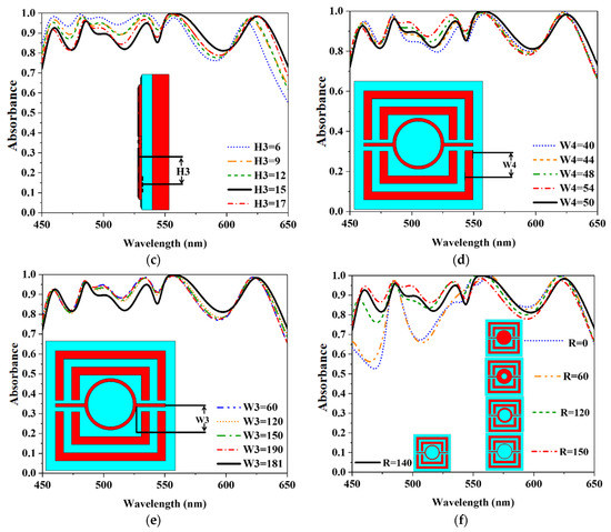 A parametric analysis is required to understand the proposed MA’s absorbance properties. The sweeping parameter plays an important role in determining the best possible design and utilization absorbance. The parameter of H1 represents the thickness of tungsten at the bottom plane. Figure 8a shows that the absorbance property is studied in the wavelength range of 30–110 nm for H1. It offers a unique absorbance curve for greater thicknesses with H1 = 100 nm. To maximize absorbance and prevent transmission, the MMA design used H1 = 110 nm, and absorbance levels are also impacted by the dielectric thickness (SiO2). Figure 8b shows the absorbance at various dielectric thicknesses for the parameter of H2. When we used H2 = 30 nm, the lower optical wavelength is absorbed more than the upper visible wavelength range. Moreover, absorbance values in the upper visible wavelength range are greater for thicker materials than those at the lower optical wavelengths. The highest average absorbance takes place at H2 = 60 nm. The MMA patch thickness is also studied for H3. There is a constant amount of absorbance for different H3 values, but there is a slight distortion in the upper optical range. The value of H3 = 15 nm has been determined as the highest absorbance level. A consistent absorbance bandwidth is achieved, and very few deformations are observed in the higher wavelength, as shown in Figure 7c. The resonator of the MMA was also studied. The value of L2 = 205, W2 = 480, W3 = 180.03, and W4 = 50 nm has been determined as the highest absorbance level. The circular ring resonator (CRR) considers R1 = 140 and R2 = 160 nm, respectively.