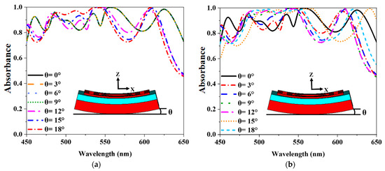 The MMA sheet may be bent during installation for external forces. Absorbance in both TE modes and TM modes has been studied for the banding effect. An absorbance curve with bending angles θ = 0° to 18° with three degrees distances is shown in Figure 12. The absorbance increases at lower wavelengths and decreases at higher wavelengths in TE mode. However, the TM mode demonstrates the same pattern of absorbance characteristics. Due to the unique absorbance property, the proposed absorber has a band-able property in the TE and TM modes, which is achieved at different banding angles.