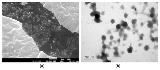 Representative ultramicrographs of pequi oil-based nanoemulsions (PeNE), acquired via (a) scanning and (b) transmission electron microscopy. Yellow arrows indicate PeNE nanodroplets in panel (a).