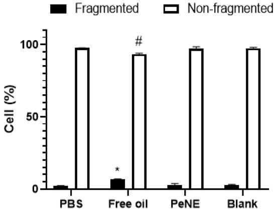 DNA fragmentation measured by flow cytometry (10,000 events/sample) in macrophage cells (J774.16) exposed to NePE (360 µg/mL), blank, and free pequi oil (180 ug/mL) for 24 h. Phosphate buffer and ethanol were used as controls. Two-way ANOVA: significant difference among fragmented groups * (p < 0.05) and non-fragmented group # (p < 0.05) (Tukey post hoc test).