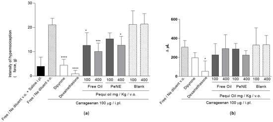 To test the anti-inflammatory and/or analgesic activity of PeNE and free pequi oil in vivo, a carrageenan-induced acute paw inflammation model was used [19,20,21]. Carrageenan (100 µg) was administered locally (hind right paw, intraplantar—i.pl.) in a volume of 100 µL per paw in all animals. One of the control groups received dexamethasone (2 mg/kg/i.p.), a potent anti-inflammatory drug, and was named as a positive control for carrageenan-induced edema evaluation. The other control group received dipyrone (120 mg/kg/i.p.), a known analgesic drug, and was named as a positive control for antinociceptive evaluation [21]. Carrageenan, dipyrone, and dexamethasone were diluted in saline, immediately before use.