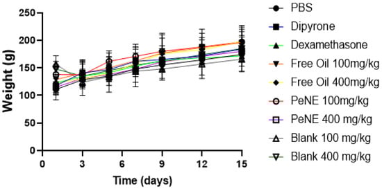 Weight of the animals during the 15 days of treatment with free oil (100 and 400 mg/kg/p.o.), nanoencapsulated pequi oil (PeNE 100 and 400 mg/kg/p.o.), blank, dipyrone (120 mg/kg/i.p.), dexamethasone (2 mg/kg/i.p.) and PBS, the negative control group.