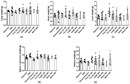 Evaluation of the weight of the organs of animals pre-treated with free oil (100 and 400 mg/kg/p.o.) or nanoencapsulated pequi oil (PeNE 100 and 400 mg/kg/p.o.) or the blank or control groups for 15 days. (a) Lung weight; (b) heart weight; (c) liver weight; (d) spleen and pancreas weight; (e) kidney weight. Statistics: ordinary one-way ANOVA. All data are presented as mean ± SD (n = 4–7).
