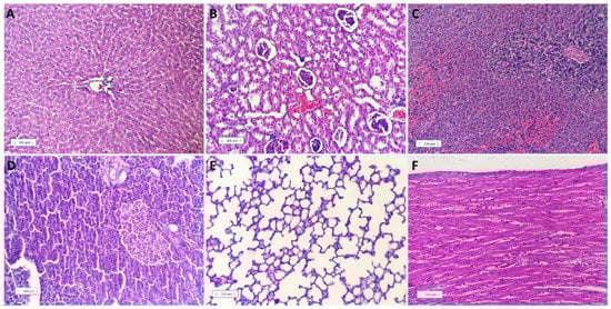 The macroscopic aspects of evaluated organs (liver, lungs, spleen, pancreas, heart, and kidneys) were preserved and similar to the control group (Figure S1, Supplementary Materials). Regarding the organ’s weight, no significant difference was observed among the experimental groups when compared to the control (Figure 9).