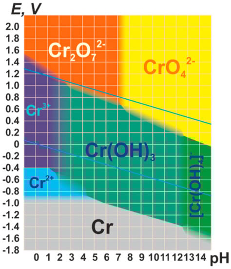 Pourbaix diagram of Cr. Reproduced from Denis Zihilin. Copyright CC BY-SA 3.0 License: https://creativecommons.org/licenses/by-sa/3.0/legalcode. “URL (accessed on 1 November 2022)”.