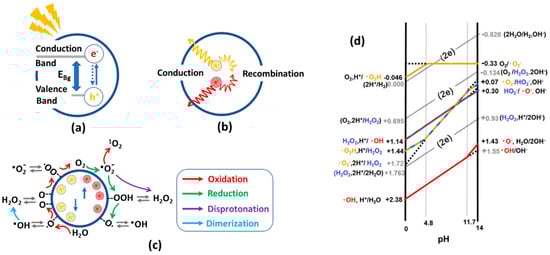 Scheme of photocatalytic process on semiconductors. (a) Illustration of the optical band gap (EBg) of a semiconductor and the separation of electrons and holes during illumination. (b) Transport and recombination of electron and hole pairs in a photocatalyst. (c) Oxygen reactive species generated due to the oxidation, reduction, deprotonation and dimerization reactions at the surface of the photocatalysts. (d) pH dependence of one-electron redox of H2O, H2O2, and O2. Dotted line shows two-electron (2e−) process. Reproduced with permission of the American Chemical society from reference [].