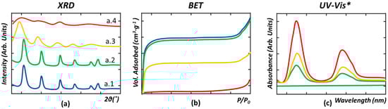 Assessing the chemical stability of MOFs is also a delicate task that requires the use of complementary characterization techniques (Figure 5). Most of the research studies to date are based on the chemical stability assessment of X-ray diffraction. This is the first step to assess if the crystallinity, and hence the long-range order of the crystalline structure, is maintained (Figure 5a) or partially (Figure 5a(a.3)) or fully (Figure 5a(a.4)) lost when the MOF material is exposed to the working conditions. Most of the studies have considered that if the MOF material maintains its XRD signature after the functioning period, its stability is proven (Figure 5a(a.1,a.2)). Nevertheless, it is important to note that this is an oversimplified assumption, since N2 adsorption measurements confirm that some MOFs that maintain their crystallinity exhibit a significant loss of porosity when immersed in water (Figure 5a,b). Therefore, the assessment of the surface is the second characterization checkpoint to assess whether the internal pore structure of the materials is maintained or has been partially or completely disrupted during operation (Figure 5a,b). In parallel, a partial dissolution during the adsorption or photocatalysis experiments could lead to a significant leaching of the metal and/or linkers of the MOF, without leading to the loss of the long-range order of its structure []. For instance, some studies have reported a significant leaching of the metal ions (quantified by inductive-coupled plasma spectroscopy) and of the organic linkers (quantified by the UV-Vis) when the MOFs are immersed in a water solution of different acidity/basicity. Therefore, a complete description of the chemical and hydrolytic stability of the MOFs requires a third characterization step where the concentration of the metals or organic linkers in the operation media is monitored to quantify the percentage of the MOF dissolved (Figure 5c). All the characterization protocols described above are shown Figure 5, where red-, orange-, green-, and blue-colored data have been used to illustrate the XRD, BET, and UV-Vis fingerprint of chemically robust, intermediate, weak, and unstable MOF materials. It is important to note that while robust and intermediate MOFs could exhibit the same XRD or BET curves after working conditions, the less robust materials could lead to the release of some of its component to the media, as illustrated by the UV-Vis spectra shown in Figure 5c.
