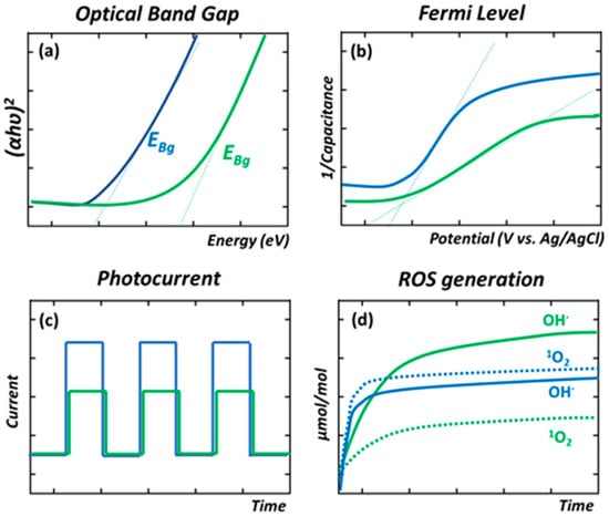 Finally, the efficiency of the ROS to oxidize/reduce chemicals is also modulated by their stabilization/coordination at the surface of the photocatalyst (Figure 6d). As an illustrative example, TiO2-anatase semiconductor materials crystallized as nanoparticles and nanotubes with different sizes, morphologies, and crystal facets show significantly different capacities to generate ROS species during illumination. In the model MOF materials used to illustrate the photochemical characterization strategy described in this review, even though the band gap and electroconduction of the MOF illustrated by the blue-colored curves of Figure 6a–c are better than the ones of the MOF model of the green curves, the generation of ROS species could be not directly related to these factors, as shown in Figure 6d. As mentioned before, although ROS quantification protocols have long been established for inorganic photocatalysts, their application to Metal-Organic framework materials is still scarce [,]. As a general rule, most of the applied protocols to indirectly determine the ROS generation are the addition of oxygen radicals or electron or hole scavengers. Thus, their effects on the photocatalytic reaction give an indirect clue of the radicals involved in the process. Just to mention one of the multiple examples reported in the bibliography, p-Benzoquinone (PBQ), sodium oxalate (Na2C2O4), tert-butyl alcohol (TBA), 2,2,6,6-tetramethylpiperidine (TEMP), and sodium iodate (NaIO3) can be used as O2•−, holes, •OH, [] O2, and electron scavengers in the solution [,].