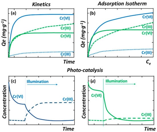 In addition, the development of batch experiments to determine the adsorption capacity and kinetics of MOFs over Cr(VI) and Cr(III) ions give highly valuable information to understand to what extent these dual sorbent/photocatalysts are able to capture these species during the Cr(VI) to Cr(III) photoreduction process (Figure 7a,b) [,]. It is important to keep in mind that Cr(III) ions are only soluble at acidic conditions, so adsorption needs to be assessed at pHs < 4 (this acidity value also depends on the Cr(III) concentration). Adsorption isotherms are obtained from batch experiments where a known amount of MOF photocatalyst is immersed in model single-element chromium solutions of increasing concentrations. In parallel, the kinetics of adsorption are obtained by monitoring the time evolution of the chromium concentration during the adsorption process (Figure 7b). Usually, MOFs show a rapid one-step adsorption over metal ions, capturing most of the species from the solution during the initial stage of the process (below 30 min). Afterwards, the adsorption kinetics is gradually slowed down until equilibrium is reached (usually ~2–4 h). Both experimental data (kinetics and adsorption isotherms) can be fitted on the basis of different models (i.e., Langmuir, Freundlich, pseudo-first- and pseudo-second-order kinetics…) that parametrize the adsorbing capacity and affinity of the sorbent for the substrate [,,,,]. Overall, the isotherms’ fitting gives access to quantifying the maximum adsorption capacity, as well as the adsorbate–adsorbent affinity of the MOF over a specific substrate. In parallel, the fitting obtained from kinetic models allows quantifying the rate of the process. In Figure 7a,b, two kinetic and isotherm curves for the adsorption of Cr(VI) and Cr(III) species by two model MOFs are illustrated. The blue-colored curves show the response of MOF materials with a high affinity to capture Cr(VI) species and a negligible capacity to adsorb Cr(III), while the green-colored curves illustrate the response of a MOF with intermediate affinities and capacity to capture both species. The surface area, pore window aperture, and presence of preferential adsorption points within the MOF structure are some of the characteristics that will shape their kinetic and isotherm adsorption profiles. That is, both the adsorption capacity and affinity of the MOFs over chromium will be shaped by the fast diffusion paths across the framework, and by the density and chemico-physical affinity of preferential adsorption sites over chromate oxyanions or trivalent chromium cationic species.