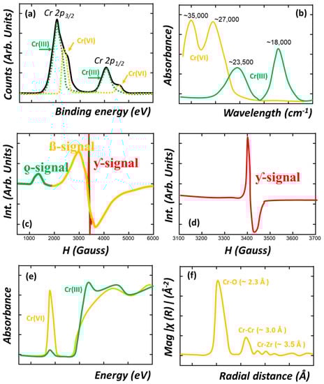 Illustration of the (a) XPS and (b) UV-Vis spectra of Cr(VI) and Cr(III) species stabilized within MOFs. (c,d) EPR spectral fingerprints arising from Cr(III) (c) and Cr(V) (d) species stabilized within MOFs after adsorption and photocatalysis. (e) X-ray adsorption near-edge structure of Cr(VI) and Cr(III) species, and the illustration of (f) the radial distances’ distribution obtained from the treatment of X-ray absorption data. Green-, orange-, and red-colored lines have been used to illustrate the signature of Cr(III), Cr(VI), and Cr(V) ions in the different plots. Dashed lines in the figure (a) stands out for the fitting of the XPS data to the contributions of Cr(VI) and Cr(III) ions.