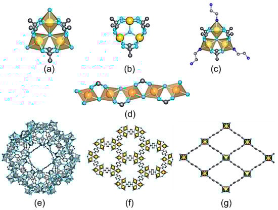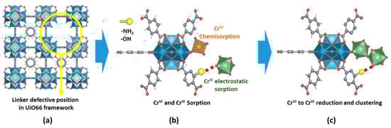 Similarly, the pore space of MOFs can be rationally encoded with specific functional groups coming from the decoration of the inorganic and organic structural units or through the encapsulation of metal, metal-oxide or metal sulphide nanoparticles, or complex poly-oxoanionic species as wolframates, molybdates or vanadate-based units (Figure 3) []. Although less explored for chromium photoreduction, the defect chemistry of MOFs, as well as their porosity metrics, has a great impact on the Cr(VI) adsorption capacity and kinetics. In addition, the local chemistry of linker-defective positions at the clusters can endow the material with Lewis and/or Brønsted sites. The coordination environments of these catalytic centers can be systematically varied in order to tune the catalytic activity.