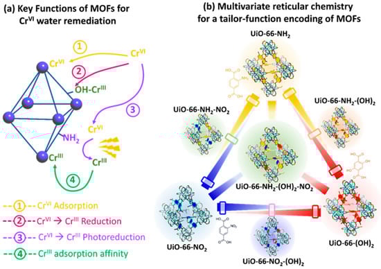 Similarly, organic linkers within MOFs play a pivotal role on their light harvesting and exciton generation and transport capacity. The versatility to decorate the chemical structure of the linkers with electron donor or withdrawing groups, or to design the linker itself as an antenna or chromophore to capture certain UV-Vis radiation, has been of paramount importance to tune the light harvesting and carrier separation and transport in MOFs (Figure 3) [,,]. In the specific case of Cr(VI) photoreduction, the chemical structure and functional groups installed into the organic linkers serve to modulate the adsorption affinity of MOFs over hexavalent and trivalent chromium species, but also to tune their light-harvesting and photoconduction efficiency []. Again, during the last few years, it has been duly proved that the chemical variance introduced by the multivariate encoding of the organic linkers within the ordered MOF structure can lead to cooperative or coupled functionalities (Figure 3). For instance, multivariate reticular chemistry offers interesting advantages to combine electron donors or withdrawing functions able to expand the band gap to the visible range, and enhance the photoconduction of the MOFs’ three-dimensional scaffolds []. Although this strategy has been rarely studied for Cr(VI) photoreduction, the initial results seed the light to a promising perspective to further implement the MOF potentials in this research area.