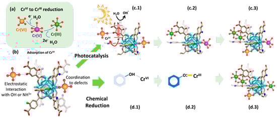 Taking into account all these abovementioned factors, the two possible responses of MOF photocatalysts during chromium photoreduction are illustrated in Figure 7c,d. In Figure 7c, the MOF is able to efficiently photo-reduce the Cr(VI) to Cr(III), but due to its negligible capacity to adsorb Cr(III), this is released to the media during photocatalysis. Opposite, in Figure 7d, the response of a model MOF that is able both to photo-transform the Cr(VI) to Cr(III), and in parallel, to adsorb the photogenerated Cr(III) species, is illustrated.