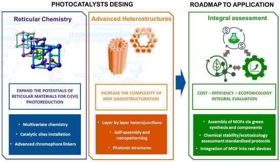 After reflecting the current state-of-the-art of MOF photocatalysts in general and specific for Cr(VI) reduction, it is clear that current investigations mainly focus on the modification of the inorganic clusters and/or organic linkers. Most of the applied functionalization strategies for chromium photoreduction are based on one functional aspect. However, recent investigations point out that site coupling or site cooperation functions can be achieved by multivariate encoding the framework and the pore space in order to reach multicomponent MOF systems for synergistic catalysis. The research of MOFs for Cr(VI) photoreduction is positioned a step back in comparison to reticular materials applied for gas adsorption or drug release, or even to other photocatalytic-related applications, such as hydrogen generation, water splitting, or organic pollutant degradation. For instance, during the last few years, the digital reticular chemistry concept has been expanding rapidly to design complex tailored functionalities within porous frameworks [,].