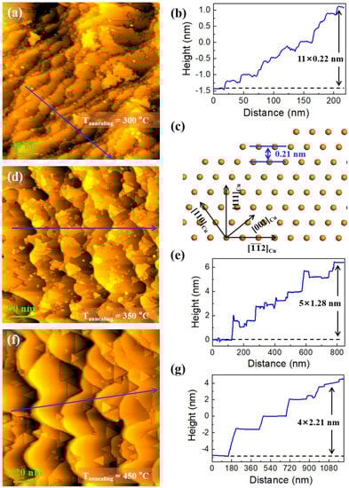 Morphology evolution from 300 °C to 450 °C. (a) STM image from the sample after Process Ⅰ annealing treatment, the blue arrow indicates the position where height profile was extracted. (b) height profile along the blue arrow in (a); (c) side view of the atomic model along the [10]Cu azimuth; (d,f) the STM images from the sample after Process Ⅱ and Ⅲ annealing treatments, respectively, the blue arrows indicate the positions where height profiles were extracted; (e,g) height profiles along the blue arrows in (d,f), respectively. Here, the scanning bias voltage and current are equal to 1 V and 0.1 nA, respectively.