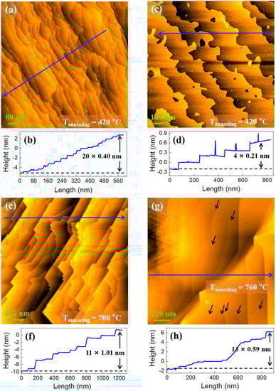 Morphology evolution from Process Ⅶ to Process Ⅹ. (a,c,e,g) STM images from the samples after annealing at 420 °C, 420 °C, 700 °C, and 760 °C, respectively; (b,d,f,h) the height profiles along the blue arrows in (a,c,e,g), respectively. The black arrows indicate the screw dislocations. Here, the scanning bias voltage and current in images (a,b) are equal to 1 V and 0.1 nA, and in images (e,g) are equal to 2 V and 0.1 nA, respectively.