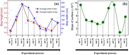 To better understand the evolution of the surface structure, we plot the graph to illustrate the changing dependence of average step width and height as a function of annealing process, as shown in Figure 4a. It can be clearly seen that the average step height (width) first increases from 0.22 nm (17.6 nm) to 2.92 nm (343.8 nm) upon increasing annealing temperature from 300 °C (Process Ⅰ) to 450 °C (Process Ⅲ), and then decreases to 0.66 nm (52.3 nm) upon further increasing the annealing temperature to 720 °C (Process Ⅵ). Here, we define a quantity named “surface slope”, which is obtained by dividing the average step height by the average step width and can be regarded as an indicator of the surface roughness. The values of the “surface slope” have been calculated according to the data from Figure 1, Figure 2 and Figure 3, and their changes with annealing process variables are drawn in curves, as shown in Figure 4b. It shows that the “surface slope” first decreases and then increases when changing the annealing temperature from 300 °C (Process Ⅰ) to 720 °C (Process Ⅵ). In addition, as the annealing process changes from Process Ⅵ to Ⅸ (720 °C → 420 °C → 420 °C → 700 °C), the “surface slope” tends to first increase and then decrease. These results indicate that high-temperature annealing (>600 °C) could enhance surface roughness. The possible reason accounting for this result would be that the phenomenon of atomic desorption at the step edge becomes more pronounced when the annealing temperature is higher than 600 °C, and hence the step width becomes narrower but the step height becomes larger, leading to a larger “surface slope”. This phenomenon, where higher annealing temperature causes rougher and higher-step-density surfaces, has also been observed on other materials such as ZnO(0001) surface [31].