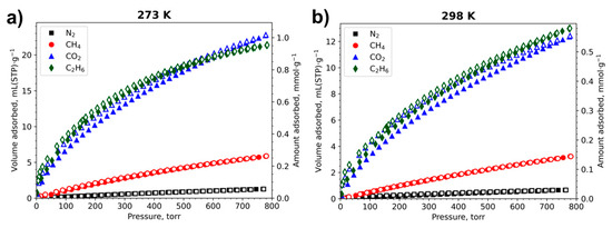 The adsorption selectivity (Sads) for a binary gas mixture could be assessed by three commonly used approaches. The ratio of adsorption uptakes, V1/V2, at 1 bar better indicates the selectivity at ambient conditions, while a ratio of Henry’s constants relates to the selectivity at low pressure range. A more complex Ideal Adsorption Solution Theory (IAST) allows selectivity calculations at any molar ratio or pressure range. The corresponding data are summarized in Table 2. There is no meaningful selectivity between C2 hydrocarbons as the corresponding values are low no matter what criteria are used for the estimations. However, there are fairly good ethane adsorption selectivity values for an equimolar mixture of ethane and methane: Sads = 12.0 at 273 K and Sads = 14.8 at 298 K (IAST). Even better values could be expected for a C2H6/CH4 = 1:9 mixture, more relevant to the selective extraction of ethane from natural gas or shale gas, as the corresponding values are Sads = 28.4 at 273 K and Sads = 39.1 at 298 K. It should be mentioned that even a moderate adsorption selectivity of Sads = 8 is considered to be high enough for practical separation applications [49].