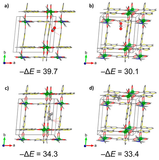 The difference between the energy of adsorbed system (Eguest@host) and the sum of energies of the empty metal–organic framework (Ehost) and non-coordinated guest molecule (Eguest) was used to compute the adsorption energies (ΔE) according to expression: