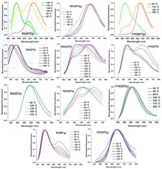 Normalized emission spectra of some thienoviologens recorded at different temperatures in the whole thermotropic range.