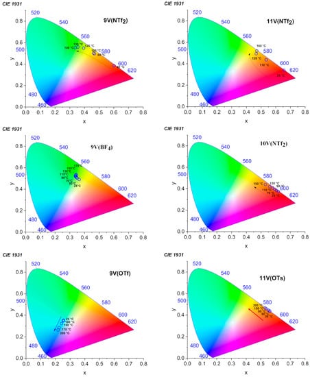 Temperature dependent 1931 CIE chromaticity coordinates of the fluorescent emission of 9V(NTf2), 9V(BF4), 9V(OTf), 10V(NTf2), 11V(NTf2), 11V(OTs).