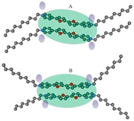 Low-energy models of dimer formed by thienoviologen salt units giving rise to a disc-like motif of elliptic shape (discoid). (A): face-to-face configuration where the planar cores have a parallel arrangement of the dipole moments associated with the thiophene rings. (B): translation of the planar cores parallel to the long axis and an anti-parallel arrangement of dipole moments associated with the thiophene rings. The counterions are indicated by the shadowed small ovals. The pendant decyl chains are drawn as pointing in the same direction in the zig-zag model A and in opposite directions in B, as an example. In general, they are in a disordered conformation. The intercore distance is 0.4 nm in A and 0.37 nm in B.