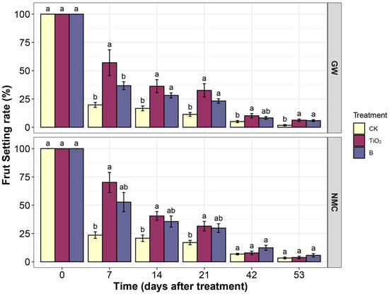 Fruit set influenced by nTiO2 and boric acid in litchi. GW: litchi cultivar ‘Guiwei’; NMC: litchi cultivar ‘Nuomici’. B: Boric acid. Different letters indicate statistical differences between treatments (p ≤ 0.05).