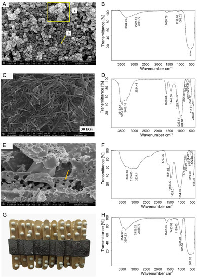 nTiO2 composite reagent. (A): SEM image of P25 nTiO2: a: agglomeration, b: dispersion; (B): FTIR spectrum of nTiO2; (C): 30 kGy radiation ATP SEM image; (D): FTIR spectrum of ATP; (E): BCS SEM image; Arrow indicates the microporous structure of BCS at 10,000× magnification under SEM; (F): FTIR spectrum of BCS. (G): Ideal structure of composite reagent; (H): FTIR spectrum of nTiO2 composite reagent.