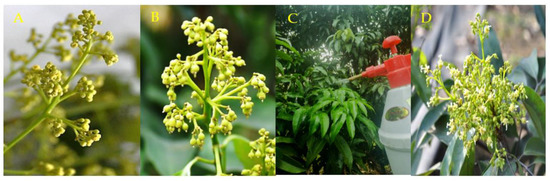 Litchi (Litchi chinensis Sonn.) is an important tropical and subtropical fruit with a distinct flavor. Litchi is cultivated in over 20 countries between 17° N and 26° N latitudes [27], where it is an indispensable part of local economies. A suitable environment (75–80% temperature, sunny days, and light) is necessary for successful pollination and fertilization. Nevertheless, the flowering and fruiting period of litchi in southern China is mainly from March to June, which coincides with the rainy season. Artificial pollination and suitable methods are usually applied to increase fruit set and yield [28,29]. Previous work has found that boron and putrescine can improve pollen viability [30]. However, only a tiny portion of the reagents mentioned above enter the water bodies, soil, and air through rainwater drenching, washing, and evaporation, resulting in severe environmental pollution. Thus, finding a reagent that facilitates flowering time to improve fruit sets is significant.
