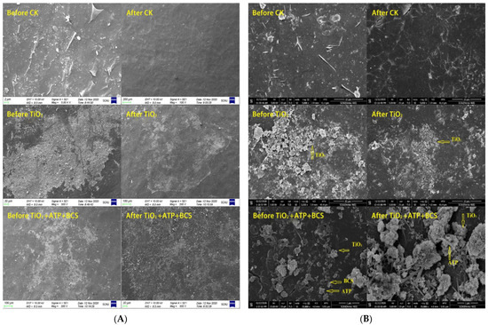 The blade of the nTiO2 composite reagent distribution. (A): 500× or less; (B): 5000× or more; Before CK: Before CK spun; After CK: After CK spun; Before TiO2: Before nTiO2 spun; After TiO2: After nTiO2 spun; Before TiO2 + ATP + BCS: Before nTiO2 composite reagent spun; After TiO2 + ATP + BCS: After nTiO2 composite reagent spun.