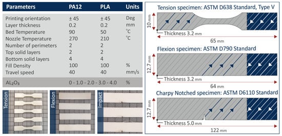 The optimal FFF 3DP parameters set up to the slicer software for the manufacturing of the neat PA12 and PLA and the Al2O3 nanocomposites (real representative tension, flexural, and impact specimens are depicted).