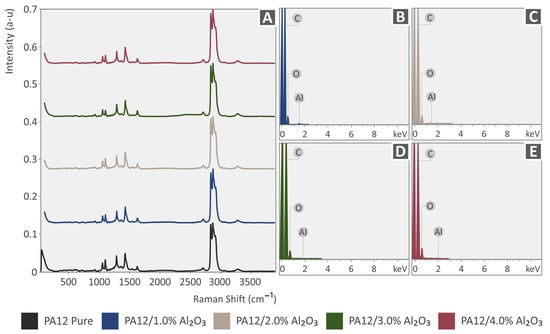 (A) Raman spectra for neat PA12, PA12 with 1.0 wt.% Al2O3, PA12 with 2.0 wt.% Al2O3, PA12 with 3.0 wt.% Al2O3, and (B–E) EDS spectra for all 3DP PA12/Al2O3 nanocomposites showing the existence of atomic Al arising from the Al2O3 incorporated nanoparticles in the PA12 polymer matrix.