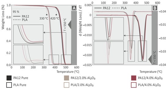 TGA investigations have been performed to reveal the temperature stability of the different materials in this study under a nitrogen atmosphere [74]. Moreover, TGA graphs proved indirectly the nature of the different nanocomposites and the existence of the specific filler loading in each specimen, via the observed remnant material at temperatures where the polymer matrix (PA12 or PLA) has been totally decomposed. Figure 5 shows the TGA (Figure 5A), and DTG (Figure 5B) curves of 3DP PA12, PA12/Al2O3 (1.0 wt.%), PA12/Al2O3 (2.0 wt.%), PA12/Al2O3 (3.0 wt.%), PA12/Al2O3 (4.0 wt.%), and PLA, PLA/Al2O3 (1.0 wt.%), PLA/Al2O3 (2.0 wt.%), PLA/Al2O3 (3.0 wt.%), PLA/Al2O3 (4.0 wt.%). As it can be observed, PA12 is more thermally stable compared to PLA, with the onset temperature of decomposition () at 420 °C, whereas PLA is at 330 °C. At temperatures above 500 °C, both polymeric materials have been fully decomposed, and the remnant material in some curves corresponds to the Al2O3 nanofillers. The remaining mass after the completion of the TGA agrees with all nano-compounds studied herein.