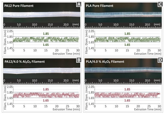Figure 6 depicts the real-time monitored filament diameter of neat polymer matrices (PA12 and PLA), as well as for the two highly loaded nanocomposites, namely the PA12/Al2O3 (4.0 wt.%) and PLA/Al2O3 (4.0 wt.%) during a period of 30 min total extrusion time. It is well-known that for FFF 3DP manufacturing, an “almost” industry standard is to work with filaments exhibiting a 1.75 mm diameter. In the study, the 3D Evo Composer 450 single screw extruder has been employed (3D Evo B.V., Utrecht, The Netherlands) with an in-built sensor that measures the filament diameter continuously during the extrusion process. It can be observed that in all cases presented in Figure 6, the filament diameter is within an acceptable range of 1.68 mm ± 0.07 mm, which is achieved by the extruder’s function to adjust the extrusion speed in-line with the extrusion process to achieve such a constant filament diameter across its length maintaining and thus the aforementioned accuracy tolerances. It is worth mentioning that high quality of filament, i.e., in diameter homogeneity, roundness, dispersion of nanoparticles, etc., is a prerequisite towards consistent and high-quality 3DP objects. Moreover, it is of utmost importance to have filaments with a constant diameter. The measured diameter of the filament is a parameter considered by the slicer software when defining the 3DP process. The microscope images from the side surface of the filament, in all nano-compounds prepared in the work, reveal a smooth, defect and void-free surface, indicating a good quality filament, showing that the parameters used in the work were the appropriate ones.