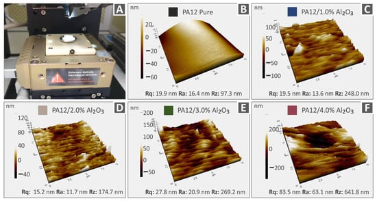 AFM topography images together with the corresponding roughness values (Rq, Ra, Rz) of PA12 and PA12/Al2O3 nanocomposite filaments (A) AFM setup, (B) PA12 pure, (C) PA12/Al2O3 1.0 wt.%, (D) PA12/Al2O3 2.0 wt.%, (E) PA12/Al2O3 3.0 wt.%, (F) PA12/Al2O3 4.0 wt.%.