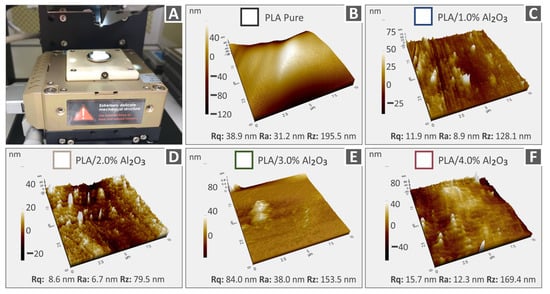 AFM topography images together with the corresponding roughness values (Rq, Ra, Rz) of PLA and PLA/Al2O3 nanocomposite filaments (A) AFM setup, (B) PLA pure, (C) PLA/Al2O3 1.0 wt.%, (D) PLA/Al2O3 2.0 wt.%, (E) PLA/Al2O3 3.0 wt.%, (F) PLA/Al2O3 4.0 wt.%.