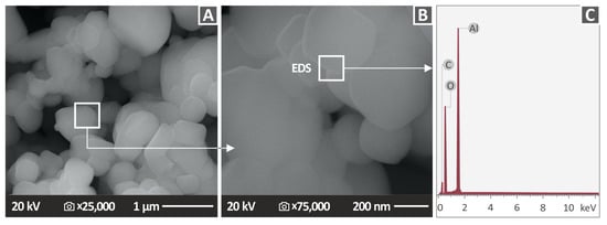 SEM images of Al2O3 powder at two magnifications: (A) 25,000×, (B) 75,000×, and (C) the corresponding EDS spectrum acquired from the Al2O3 powder.