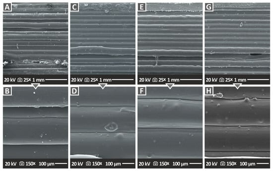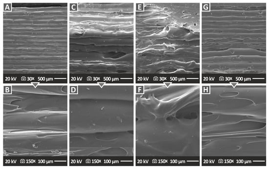 SEM images of the side surface morphology of (A,B) PLA/Al2O3 (1.0 wt.%), (C,D) PLA/Al2O3 (2.0 wt.%), (E,F) PLA/Al2O3 (3.0 wt.%), and (G,H) PLA/Al2O3 (4.0 wt.%).