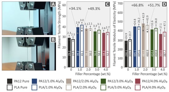 (A,B) Representative neat polymer and nanocomposite polymer filament under testing; (C,D) Tensile strength and tensile modulus of elasticity for 3DP PA12, PLA, and all nanocomposite filaments at 1.0, 2.0, 3.0, and 4.0 wt.% Al2O3 filler loading. Legend shows which color corresponds to which material in each graph.