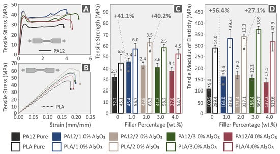 (A,B) Tensile stress (MPa) vs. strain (%) stress–strain curves for PA12 and PA12/Al2O3 nanocomposites, as well as for PLA and PLA/Al2O3 nanocomposites; (C,D) Tensile strength and tensile modulus of elasticity for 3DP PA12, PLA and all nanocomposites at 1.0, 2.0, 3.0, and 4.0 wt.% Al2O3 filler loading. Legend shows which color corresponds to which material in each graph.