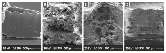 SEM images of the tensile specimens’ fractured surface morphology of (A) PA12/Al2O3 (1.0 wt.%), (B) PA12/Al2O3 (2.0 wt.%), (C) PA12/Al2O3 (3.0 wt.%), and (D) PA12/Al2O3 (4.0 wt.%), all at 30× magnification.
