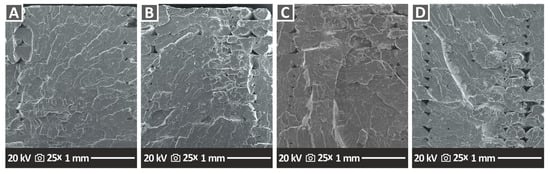 SEM images of the tensile specimens’ fractured surface morphology of (A) PLA/Al2O3 (1.0 wt.%), (B) PLA/Al2O3 (2.0 wt.%), (C) PLA/Al2O3 (3.0 wt.%), and (D) PLA/Al2O3 (4.0 wt.%), all at 25× magnification.