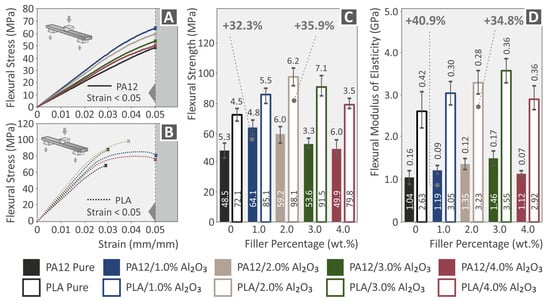 (A,B) Flexural stress (MPa) vs. strain (%) comparative and representative stress–strain curves for PA12 and PA12/Al2O3 nanocomposites, as well as for PLA and PLA/Al2O3 nanocomposites; (C,D) Average flexural strength and flexural modulus, along with the calculated standard deviation values, for 3DP PA12, PLA and all nanocomposites at 1.0, 2.0, 3.0, and 4.0 wt.% Al2O3 filler loading. Legend shows which color corresponds to which material in each graph.