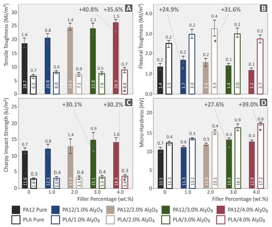Tensile toughness (A), Flexural toughness (B), Charpy’s notched impact strength (kJ/m2) (C), and Micro-hardness (Vickers (HV)) (D) properties of neat PA12 and PLA, as well as of their respective nanocomposites at 1.0, 2.0, 3.0, and 4.0 wt.% of Al2O3 filler loading. Legend shows which color corresponds to which material in each graph.