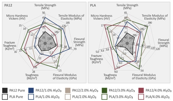 Spider graph summarizing the experimentally determined mechanical properties of pure PA12 and PLA compared to PA12/Al2O3 and PLA/Al2O3 3DP nanocomposites at 1.0, 2.0, 3.0, and 4.0 wt.% of Al2O3 filler loading. The shaded area presents the mechanical response of the pure materials. Legend shows which color corresponds to which material in each graph.