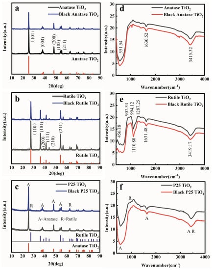(a) XRD patterns of anatase TiO2 and black anatase TiO2; (b) XRD patterns of rutile TiO2 and black rutile TiO2; (c) XRD patterns of P25 and black P25; (d) FTIR spectra of anatase TiO2 and black anatase TiO2; (e) FTIR spectra of rutile TiO2 and black rutile TiO2; (f) FTIR spectra of P25 and black P25. A and R in (c) and (f) represent the peaks from anatase and rutile phases, respectively.