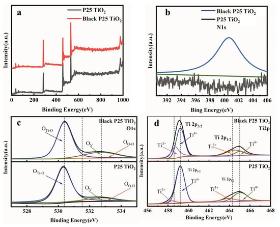 (a) XPS survey of P25 TiO2 and black P25 TiO2; (b) N1s XPS spectra of P25 TiO2 and black P25 TiO2; (c) O1s XPS spectra of P25 TiO2 and black P25 TiO2; (d) Ti2p XPS spectra of P25 TiO2 and black P25 TiO2.